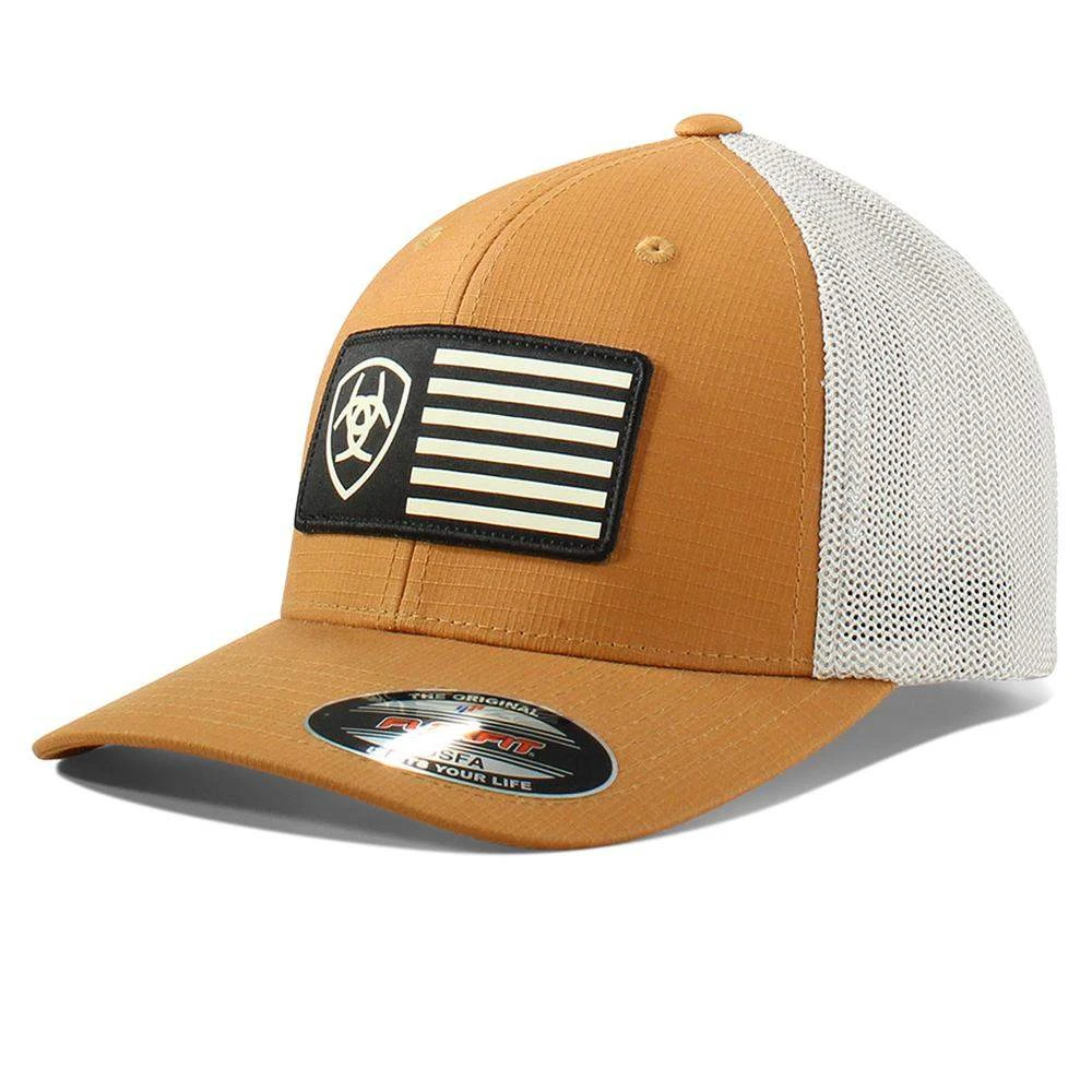 Ariat cap with black embroidered flag patch featuring an adjustable snap closure and eyelets for ventilation.