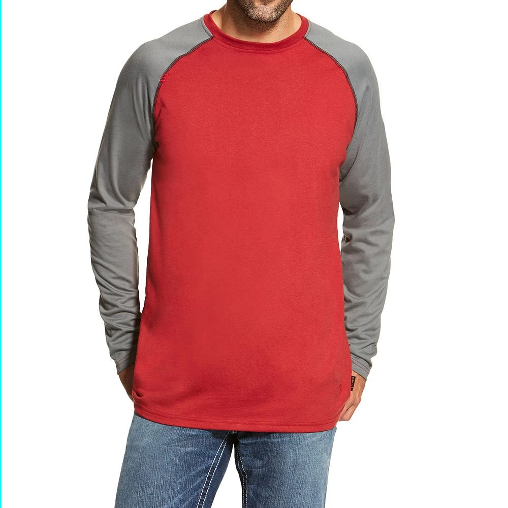 Go to work in style in our flame resistant long sleeve red and grey baseball tee from Ariat.