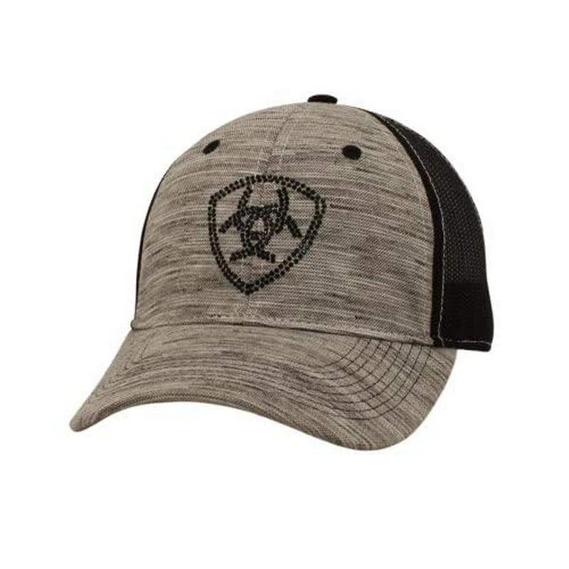 A cap with bling? Yes, please. This fashionable style is decked out in gray front panels and bill with shimmery rhinestones forming the shape of the Ariat shield. Black mesh back with Ariat embroidered over the opening in the back. Adjustable snapback closure.