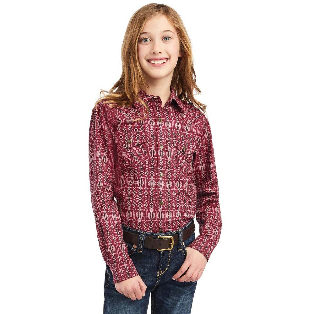 Every budding rodeo star needs a good button-up. This one mixes traditional styling with a Southwestern-inspired print to create a shirt she’ll wear from school to the barn.